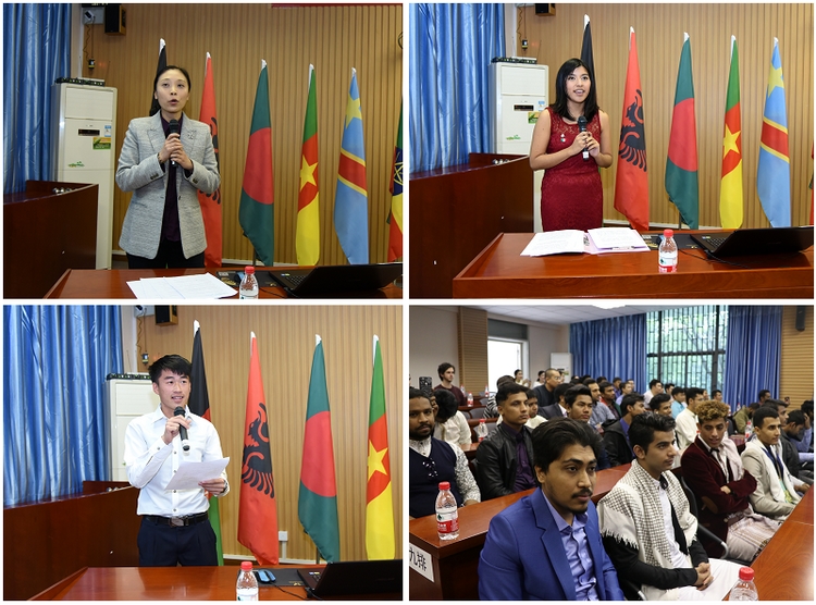 教师代表、来自工商管理学院的朱珠老师(左上)鼓励国际学生充分利用学校资源,勤学苦练,取得学业成功;高年级国际学生代表,来自墨西哥的2014级的庞贝贝(右上)同学与2017级国际新生(左下)分享了自己在学校的学习和生活经历,并给大家提出了很多有益的学习和生活上的建议;新生代表、来自老挝的李思同学用流利的汉语和大家分享了汉语学习的经历,并祝愿新同学也能在学校学有所得、收获良多。
